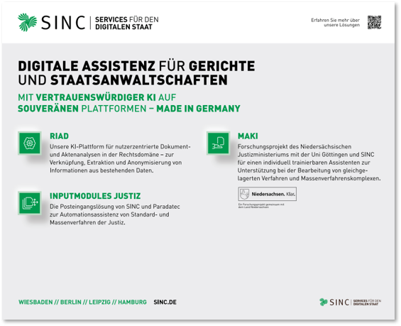 SINC entwickelt Services für den digitalen Staat. Wir sind überzeugt, dass starke und leistungsfähige Institutionen die Voraussetzung für einen funktionierenden demokratischen Rechtsstaat sind. Deshalb arbeiten wir bei SINC mit rund 450 motivierten und fachlich exzellenten Mitarbeitenden dafür, dass der öffentliche Sektor bestmögliche Leistungen für Bürger und Unternehmen erbringen kann. Über Softwareentwicklung, Beratung, IT-Infrastruktur bis zum Anwendungsbetrieb entwickeln wir hochmoderne digitale Lösungen in den Bereichen GovTech, LegalTech und Künstliche Intelligenz. Seit 25 Jahren unterstützen wir Deutschland dabei, Verwaltungs- und Rechtsprozesse mit größtmöglicher Automatisierung durchzuführen.